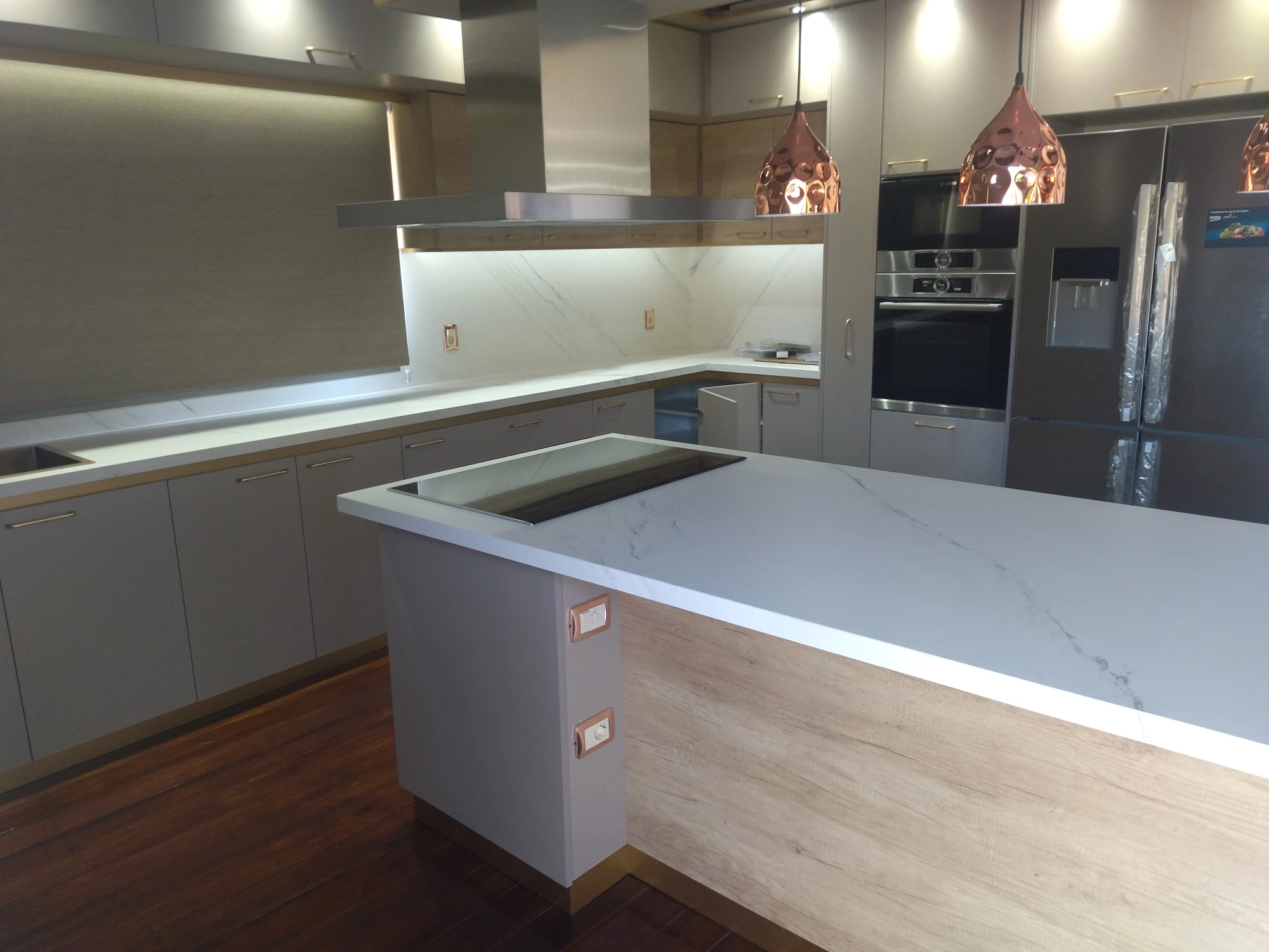 Mobiliario de cocina en melamínico bronce cepillado combinado con melamínico roble de nebraska natural.